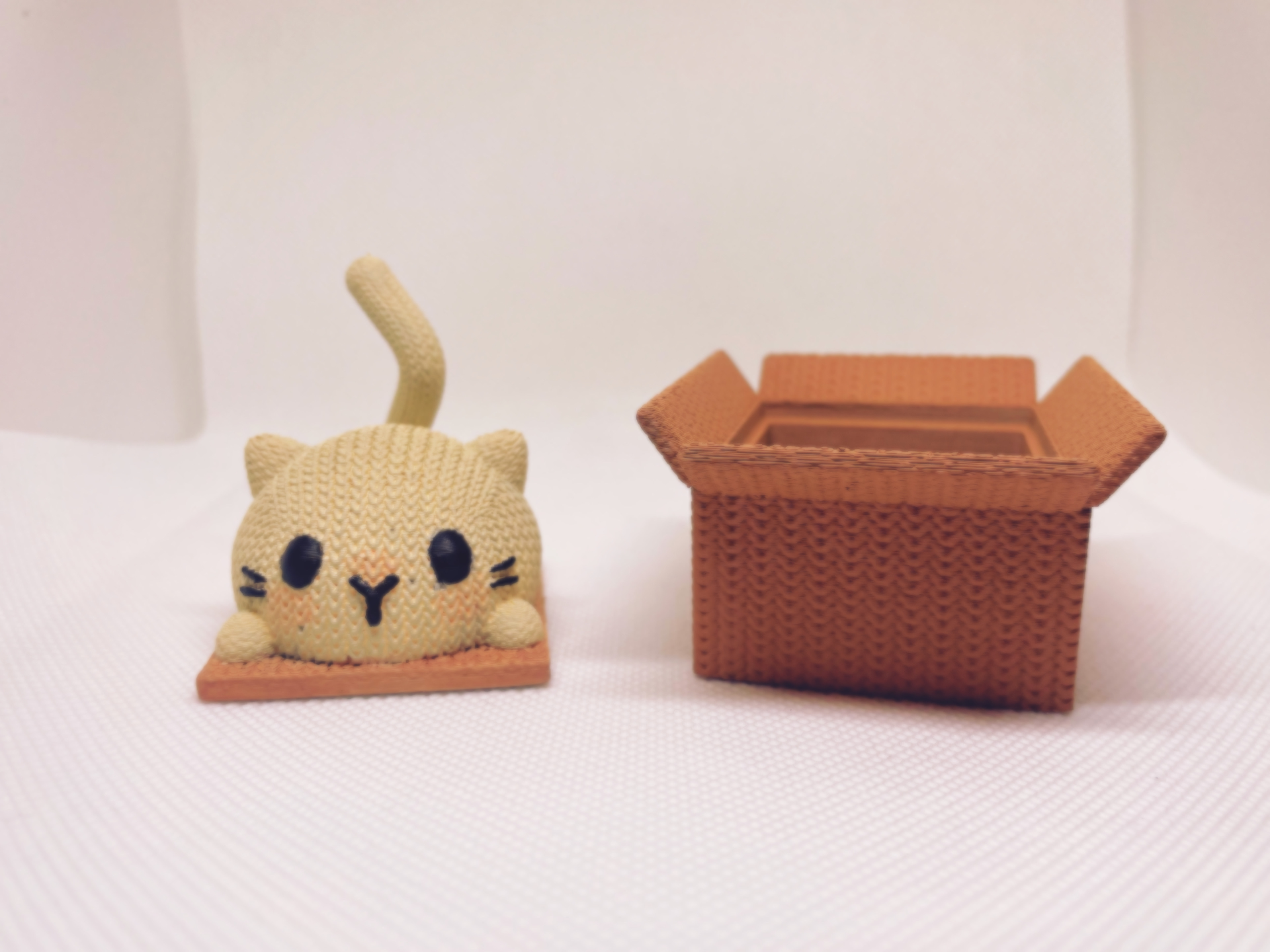 adorable knit-textured cat peeking out of a box, combining playful charm with practicality. The intricately designed box doubles as a small storage container, perfect for holding coins, paperclips, or other tiny essentials. Whether used as functional decor, a collectible, or a thoughtful gift for cat enthusiasts, this model adds a cozy, handmade vibe to any space.